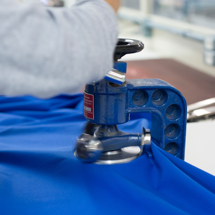 Para realizar o ensaio, a amostra de malha é colocada sob o cortador circular, um equipamento que retira pequenas seções do tecido, chamadas de “bolachas”.