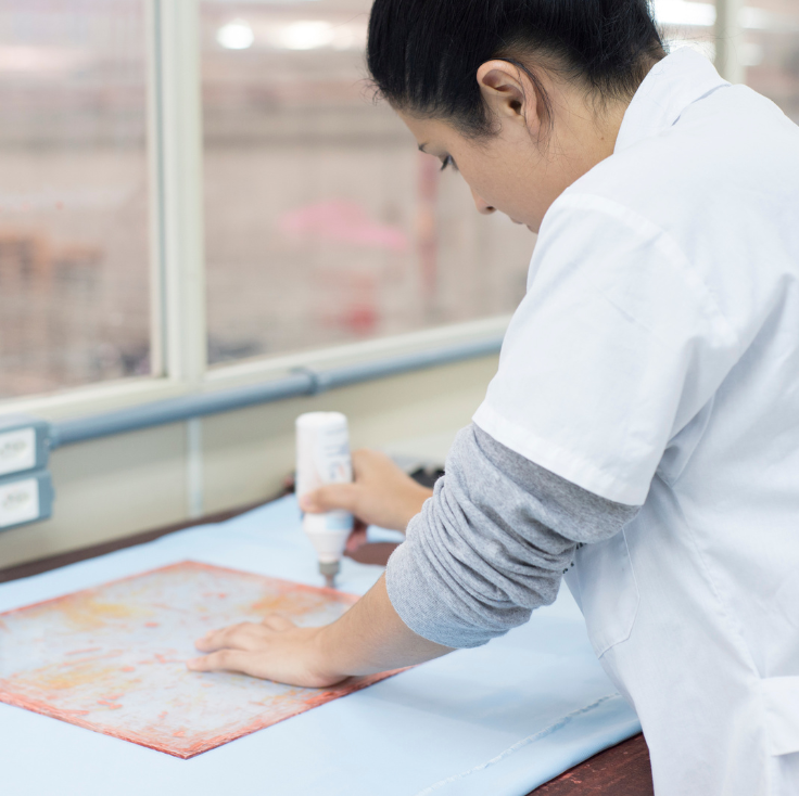 Em seguida, o tecido é submetido a uma lavagem doméstica simulada, com sabão em pó e secagem em máquina tumbler por 60 minutos.